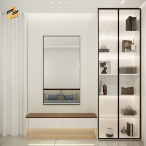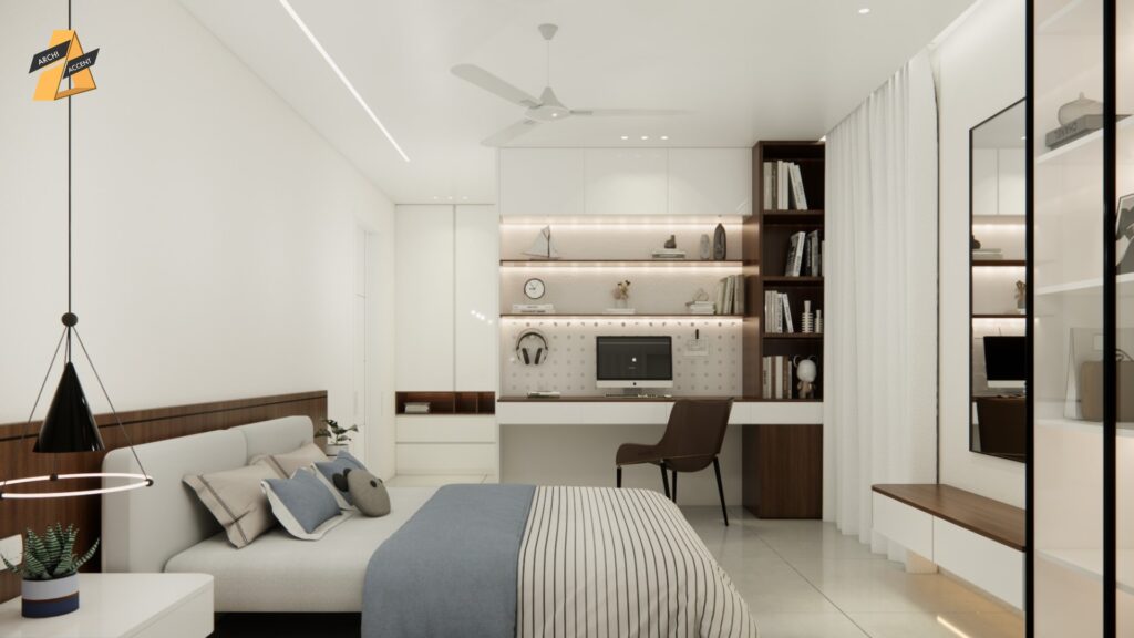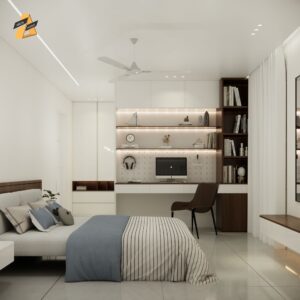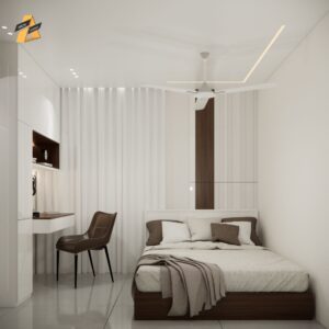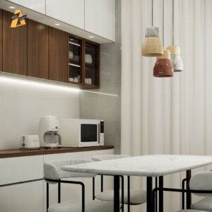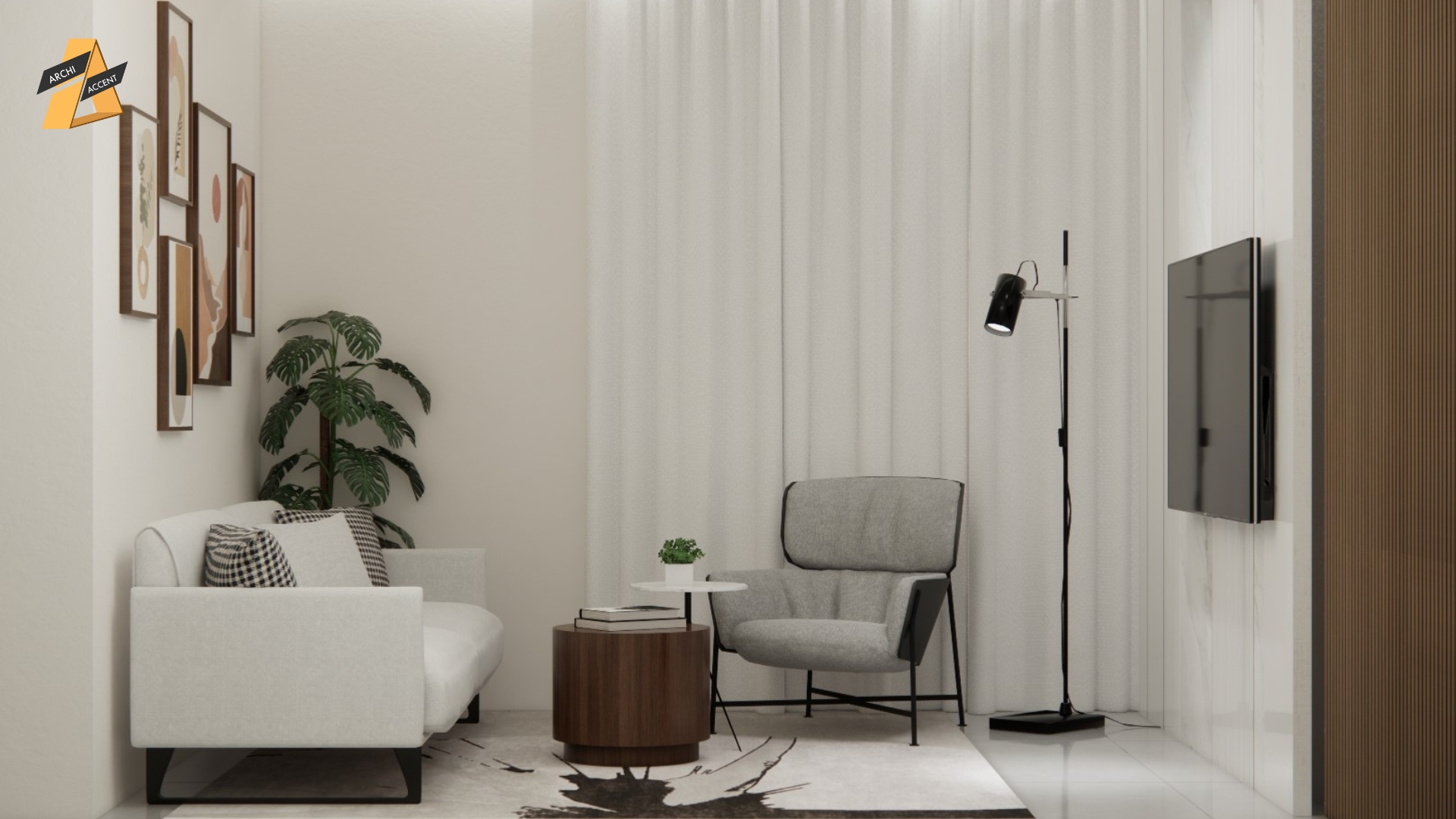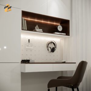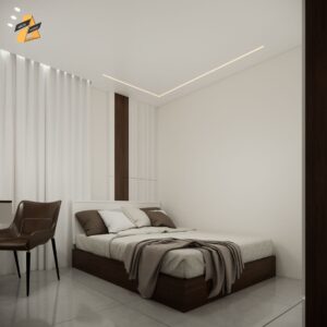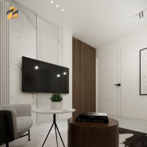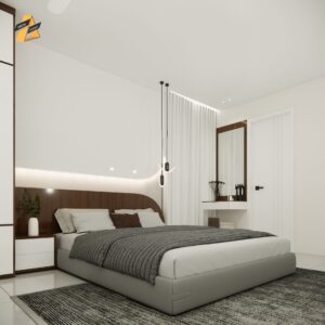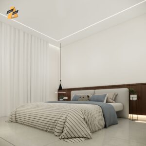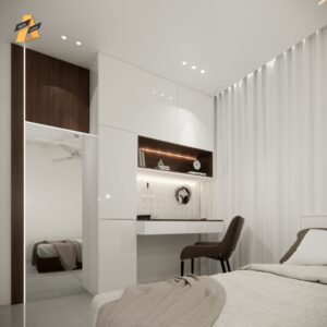 ক্রিম-হোয়াইট ও ন্যাচারাল উড টোনে সাজানো, যেখানে সফ্ট লাইটিং ও স্লিক ফার্নিচার তৈরি করেছে modern yet warm পরিবেশ।