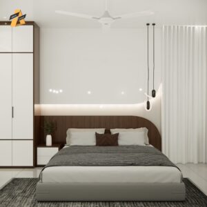 মিনিমাল টোনের মধ্যে সফ্ট ফ্যাব্রিক টেক্সচার ও লাইট উড অ্যাকসেন্ট রুমটিকে restful retreat বানিয়েছে।