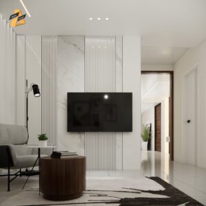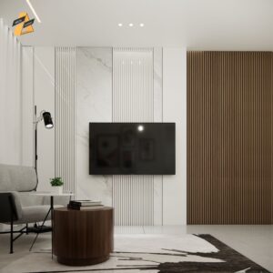 কোজি ফ্যামিলি বন্ডিং-এর জায়গা, যেখানে টিভি প্যানেলের পিছনে রয়েছে হিডেন স্লাইডিং ডোর; স্পেসটাকে visually seamless রাখে এবং একটি calm zone তৈরি করে।