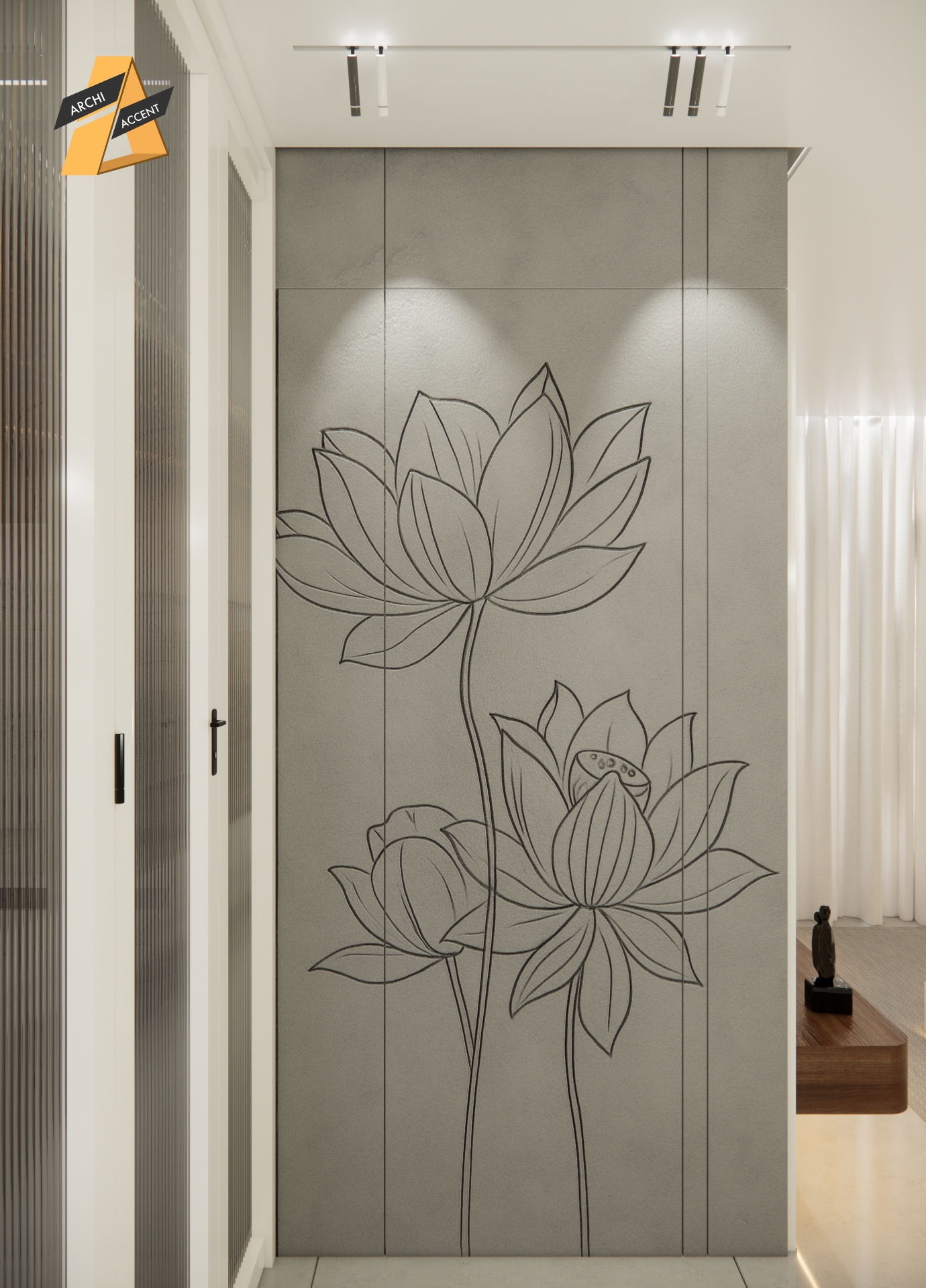 3D লোটাস আর্টওয়ার্ক ওয়াল প্যানেল, যা শুধু আকর্ষণীয় নয়; হিডেন ডোর হিসেবেও কাজ করে — welcoming এবং functional দুটোই।