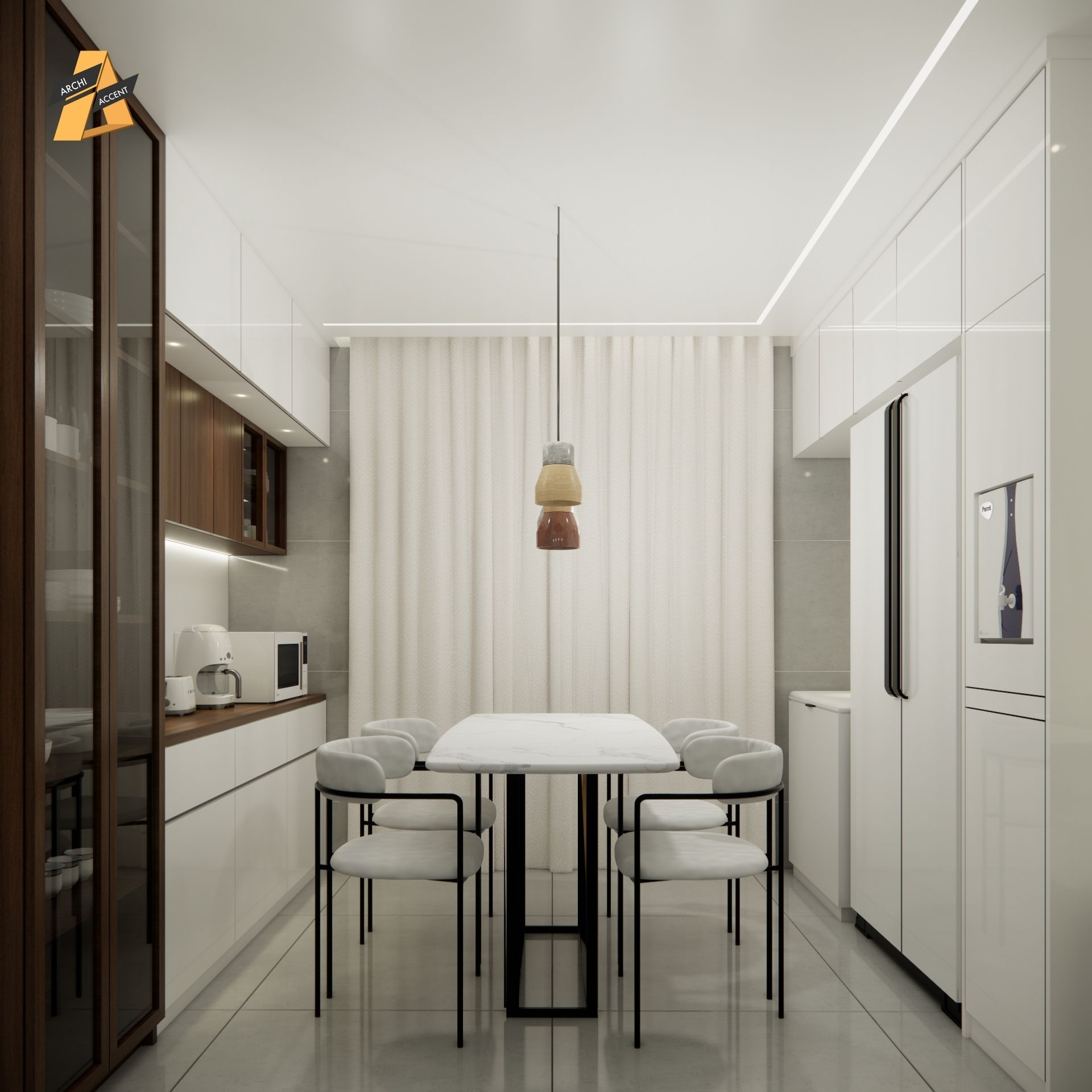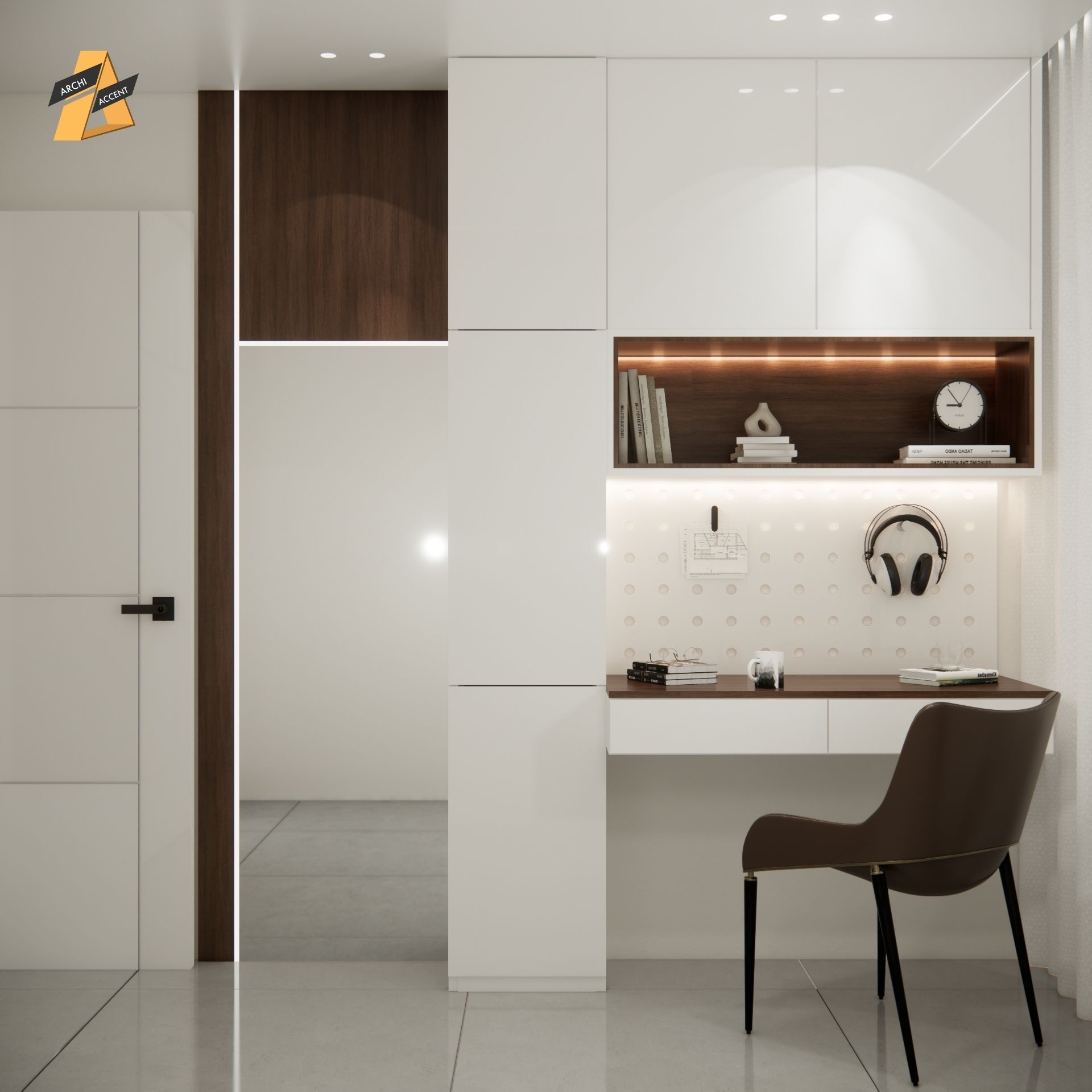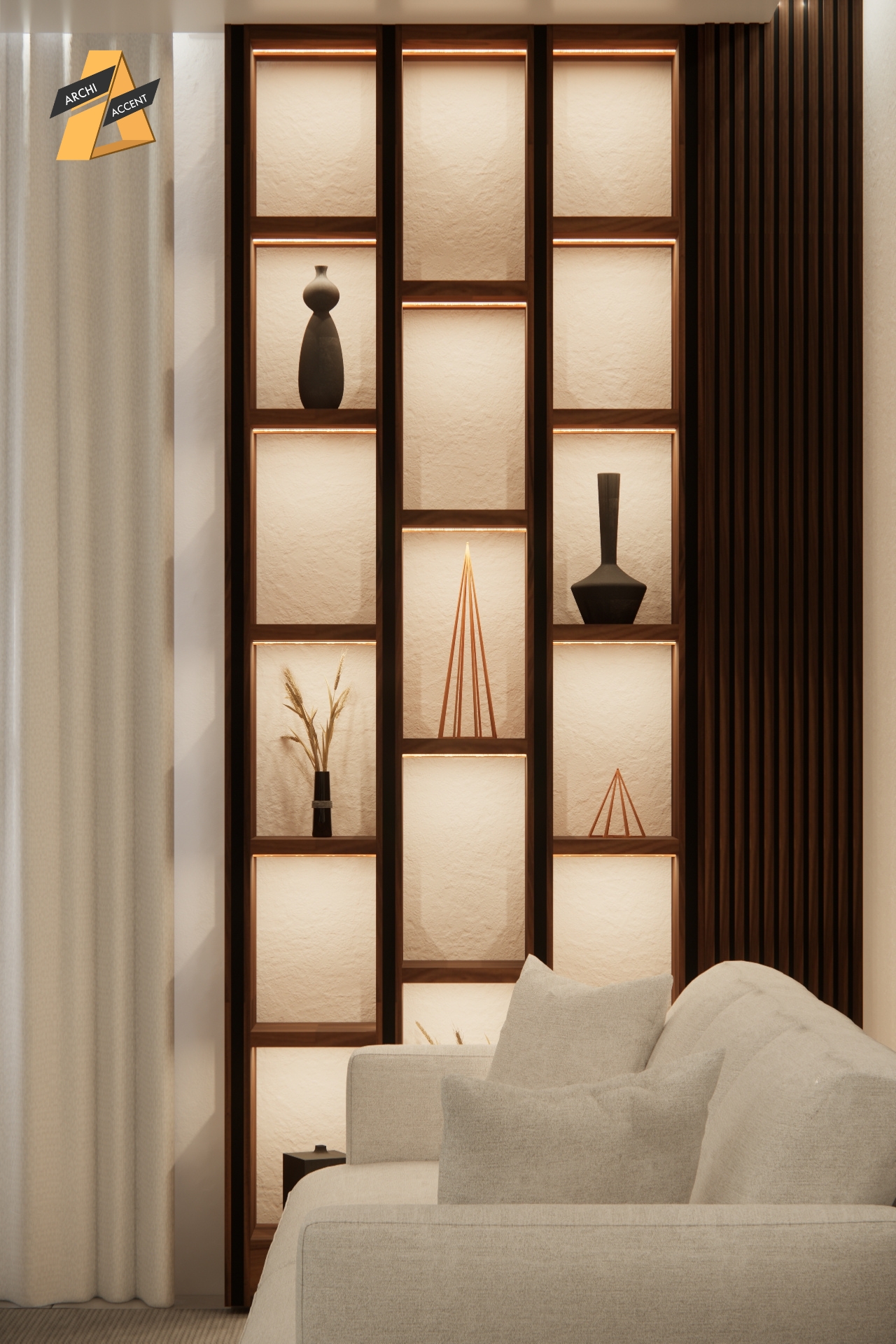 ক্রিম-হোয়াইট ও ন্যাচারাল উড টোনে সাজানো, যেখানে সফ্ট লাইটিং ও স্লিক ফার্নিচার তৈরি করেছে modern yet warm পরিবেশ।