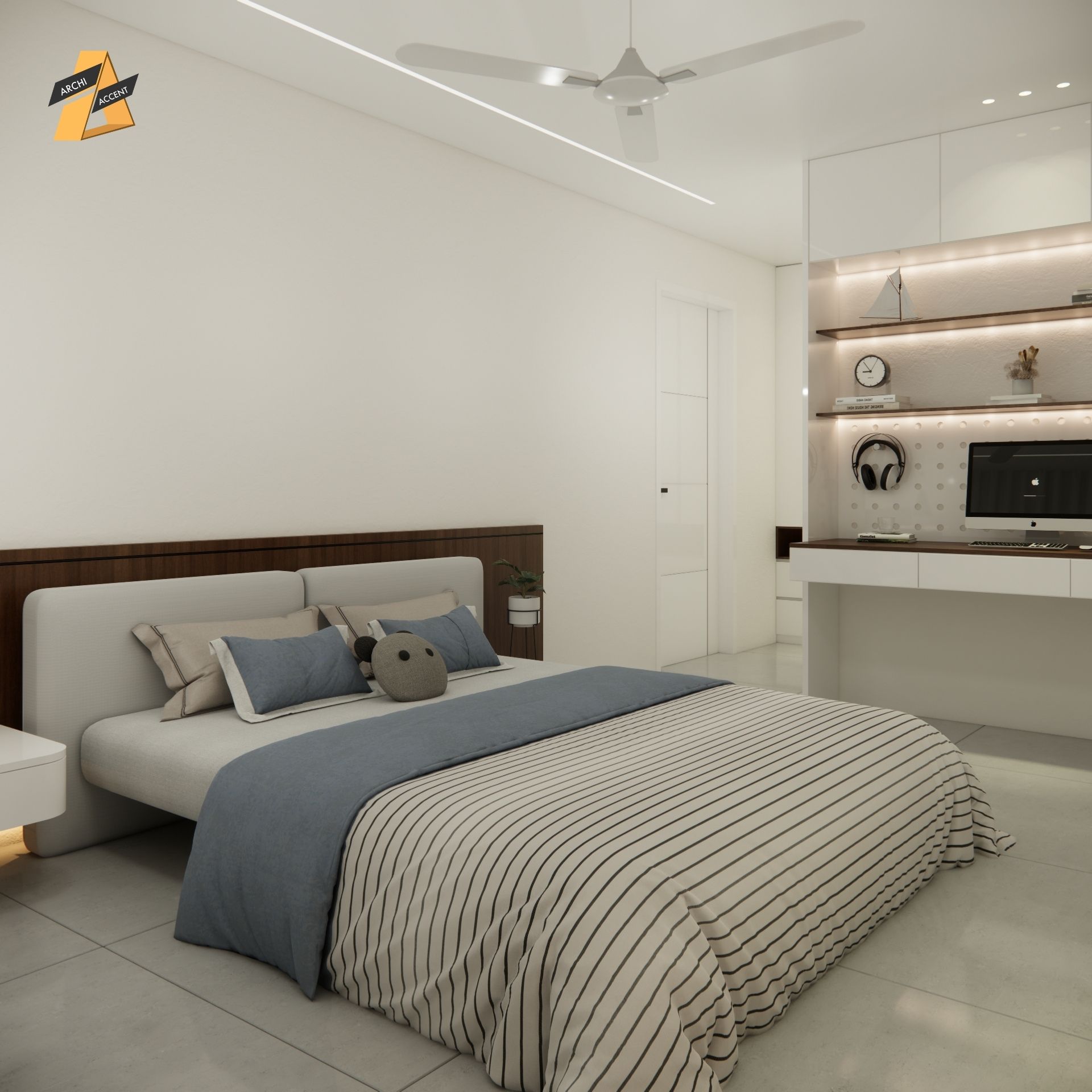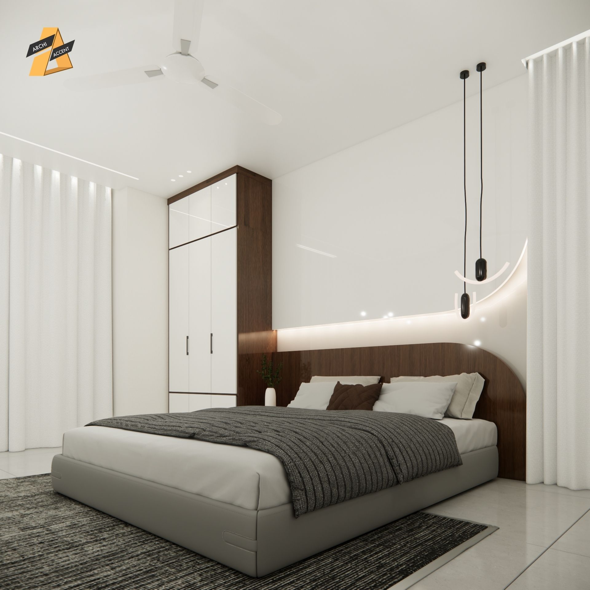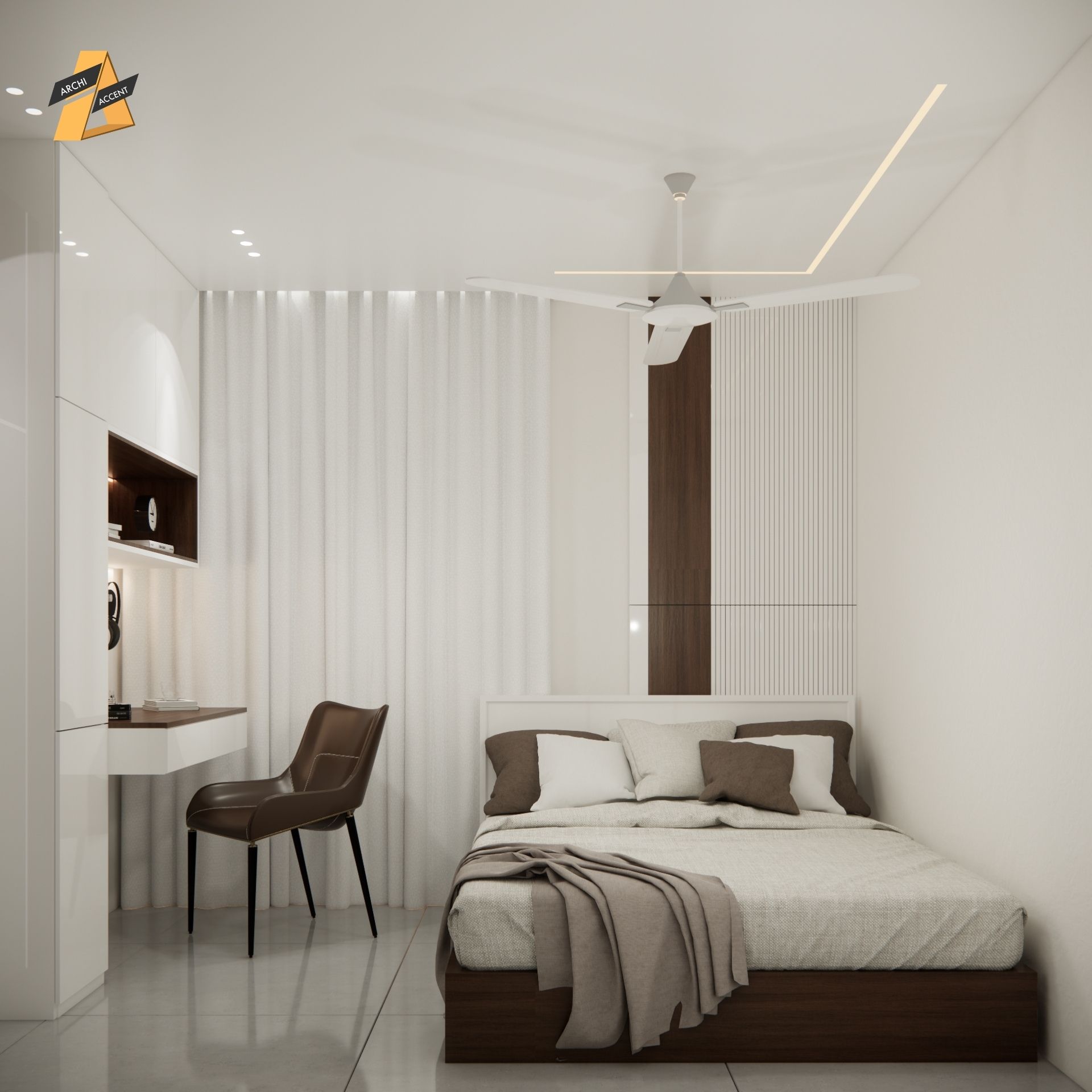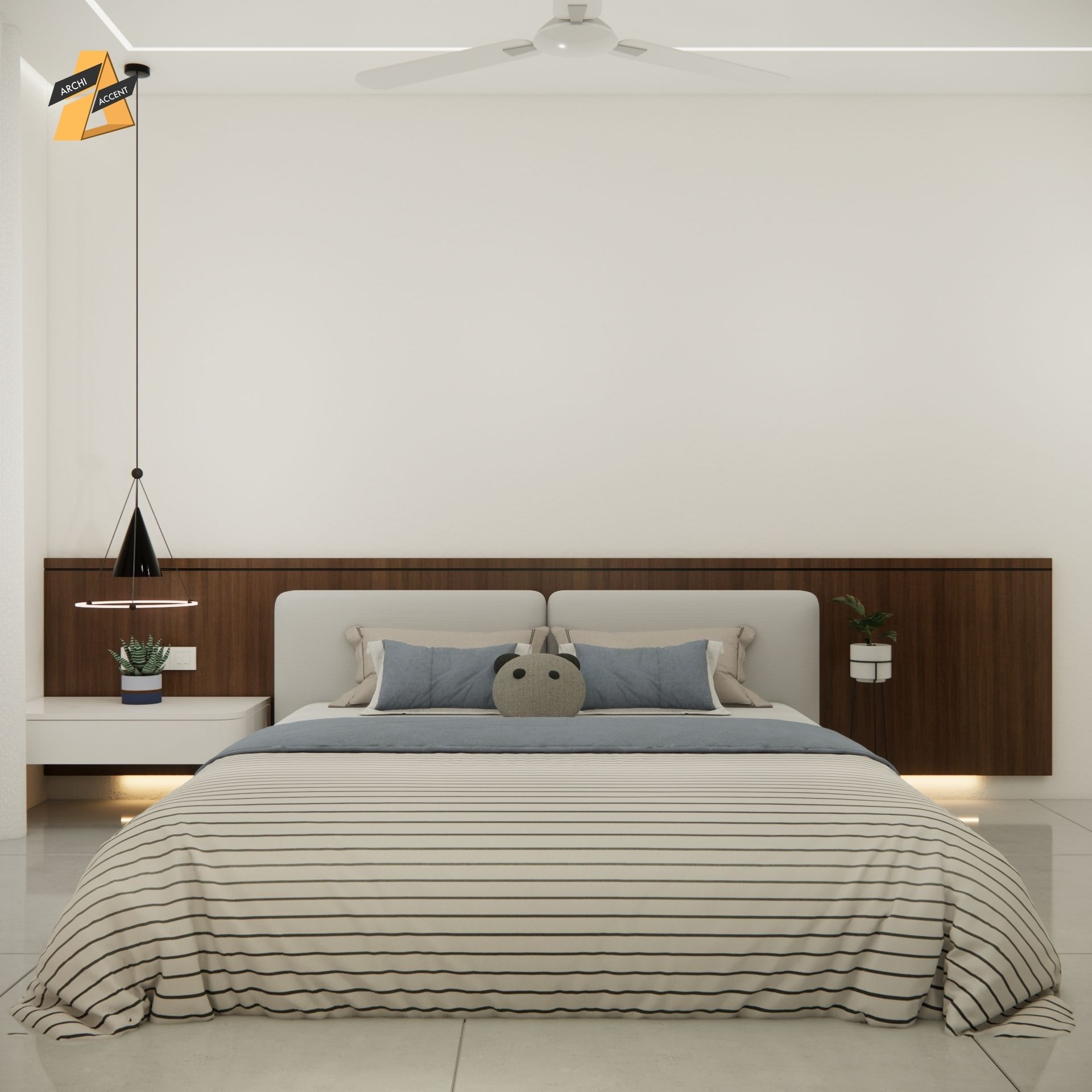 মিনিমাল টোনের মধ্যে সফ্ট ফ্যাব্রিক টেক্সচার ও লাইট উড অ্যাকসেন্ট রুমটিকে restful retreat বানিয়েছে।